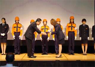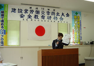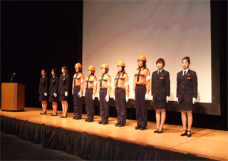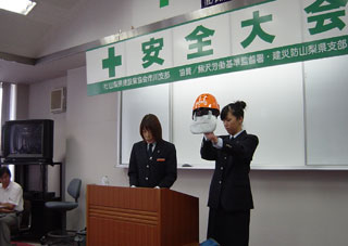 建災防山梨県支部オレンジ隊が去る平成19年9月28日横浜新都市ホールにて全国大会にて日頃の活動を発表した。「あたえよう 再点検のプレゼント」をスローガンに行動を開始したオレンジ隊、今年で10年目を迎え、これまでの活動の様子をダイジェストで紹介。来場者に建設現場に安全の願いを込めたメッセージを伝えた。