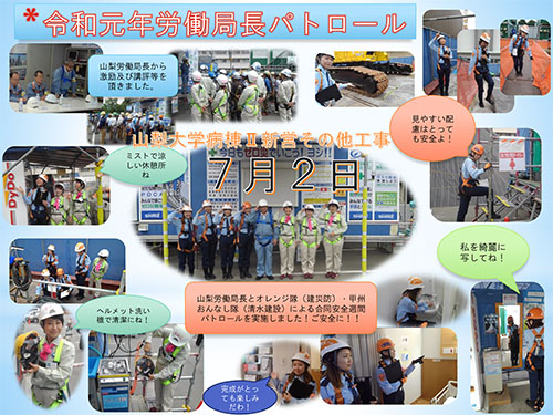 令和元年7月2日、山梨労働局長とオレンジ隊(建災防)・甲州おんなし隊(清水建設)による合同安全週間パトロールを実施しました。
